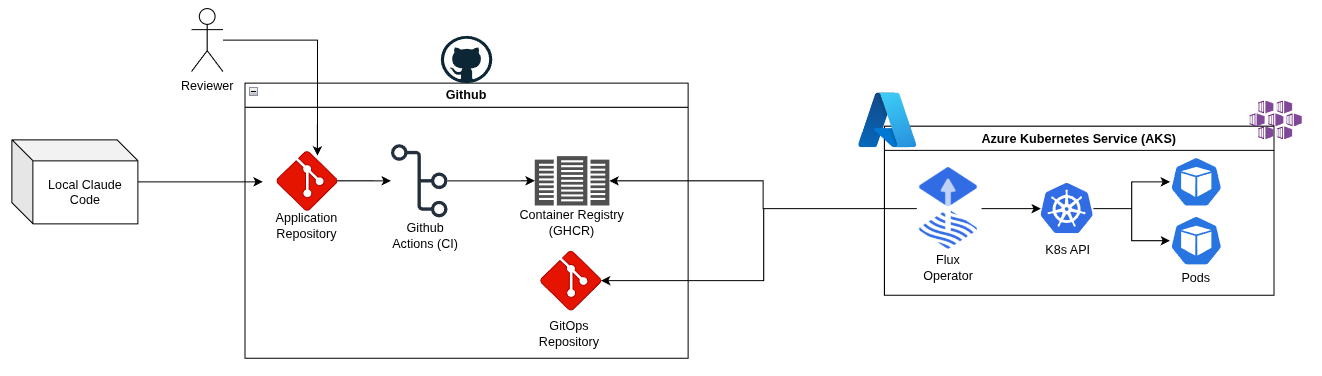 (STAGE 1: AZURE, STAGE 2: AWS, STAGE 3: GCP)The infrastructure is a hybrid monorepo (application repo, gitops repo) in Github, where Github Actions co-ordinate application test, build, and push to Github's Container Registry (GHCR). From there, Flux's Image Update Automations will detect changes and modify the GitOps repo, triggering Flux to reconcile. Yes I know this is overkill.